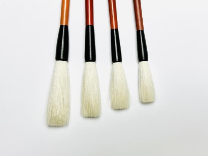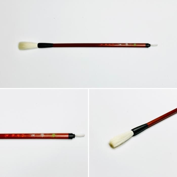 この価格帯としては非常に上質な純羊毛筆。柔らかめで、含墨、まとまりとも良い。初心者が使いこなすのはやや難しいものの、腕を磨くには最適漢字 作品向き